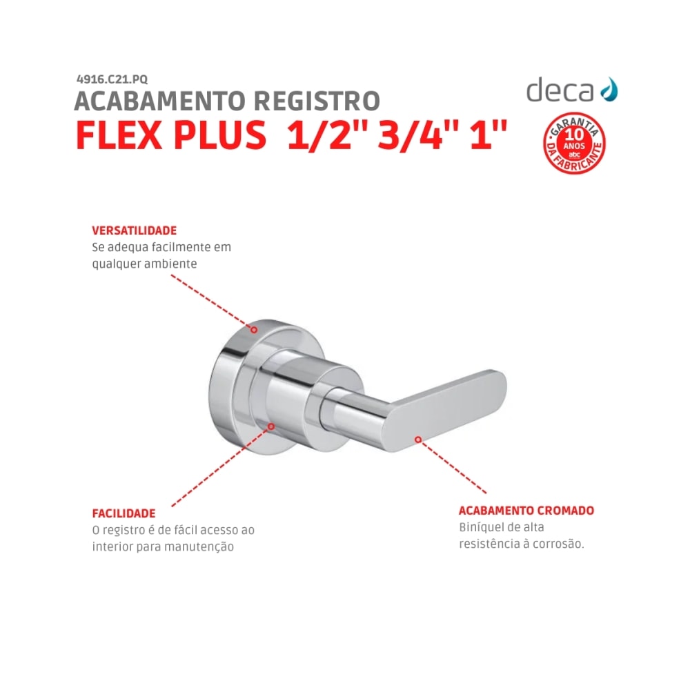 A nova linha Flex Plus foi criada para proporcionar um maior conforto e praticidade em sua utilização. Conta com a mais moderna tecnologia em seu mecanismo; tornando a abertura e fechamento do seu registro mais suave e simples. É uma linha completa que pode ser utilizado em seu banheiro; cozinha e área de serviço.