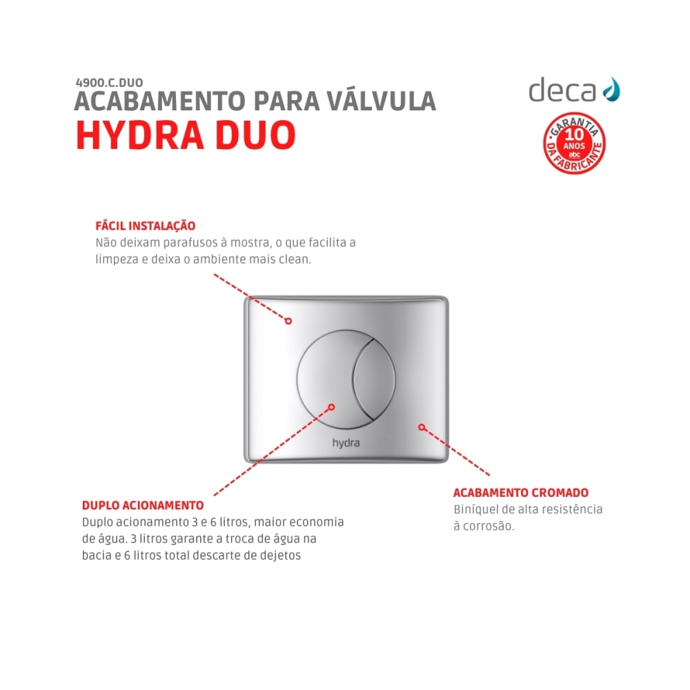 A Deca possui produtos produzidos entre os mais elevados padrões de qualidade, e por isso oferece Garantia de 10 anos a partir da data de aquisição do produto.