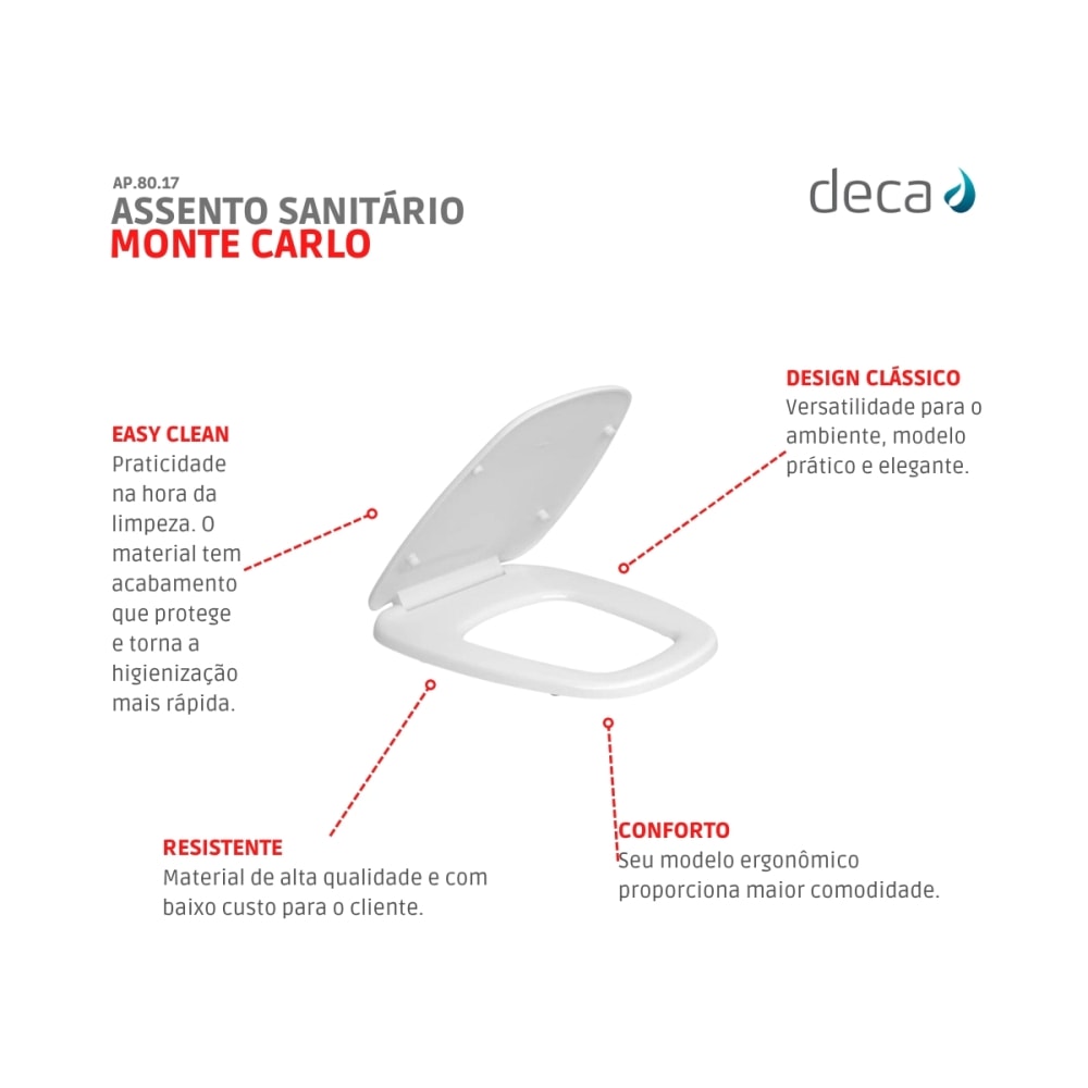 O Assento Monte Carlo AP80 Branco da Deca é um produto com design moderno e bordas arredondadas em cor branca, combinando perfeitamente com a bacia e garantindo qualidade e conforto ao banheiro. O assento possui sistema de Microban, com proteção antibacteriana que evita a proliferação de bactérias na superfície do assento sanitário. Este produto é uma boa opção para quem busca um assento sanitário prático, durável e elegante para equipar banheiros residenciais.