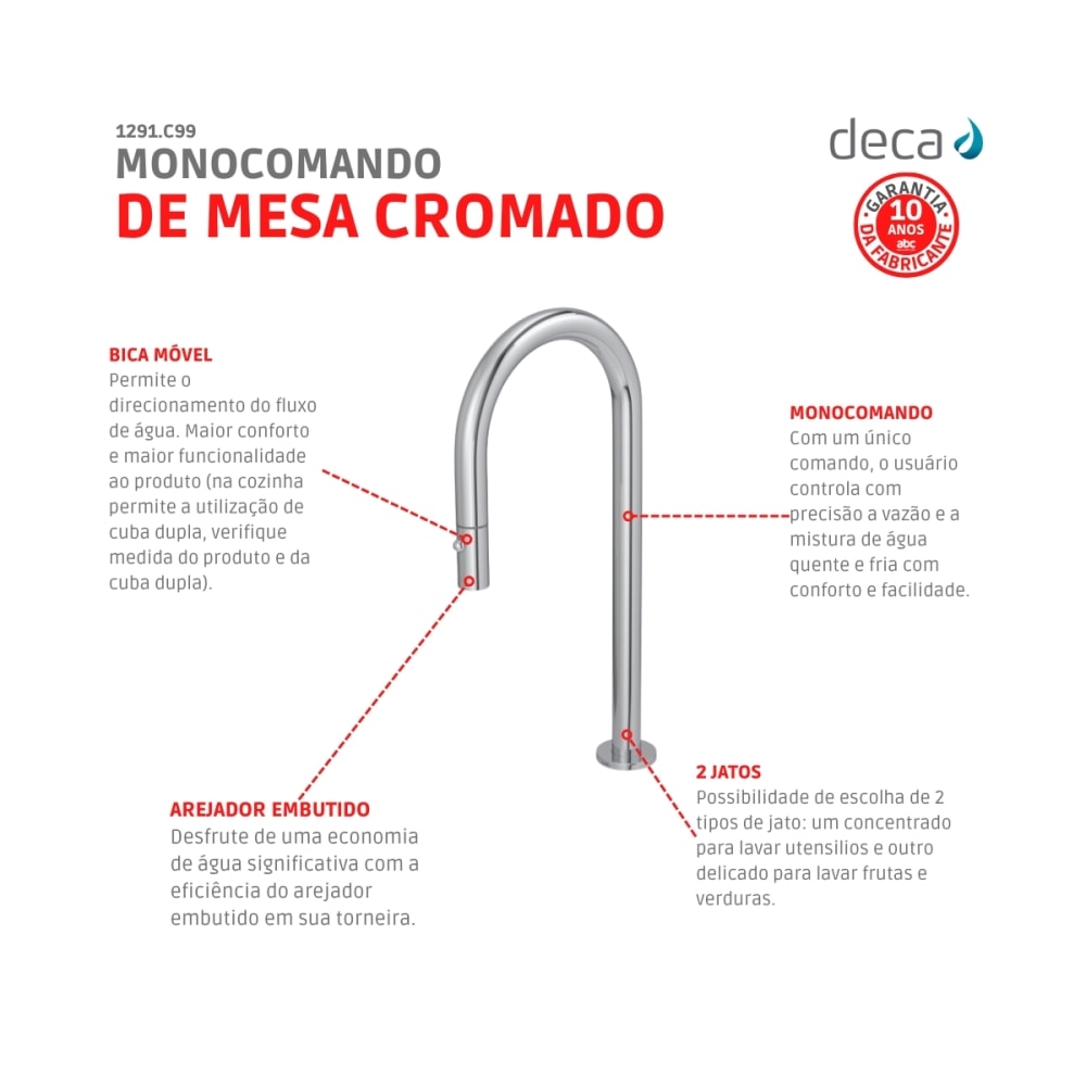 - Bica móvel para maior conforto e funcionalidade: A bica móvel do produtopermite direcionar o fluxo de água conforme a necessidade, proporcionando maiorconforto durante o uso. Além disso, essa característica torna o produto maisfuncional, especialmente em cozinhas com cubas duplas, possibilitando o ajustede acordo com as medidas do produto e da cuba dupla.