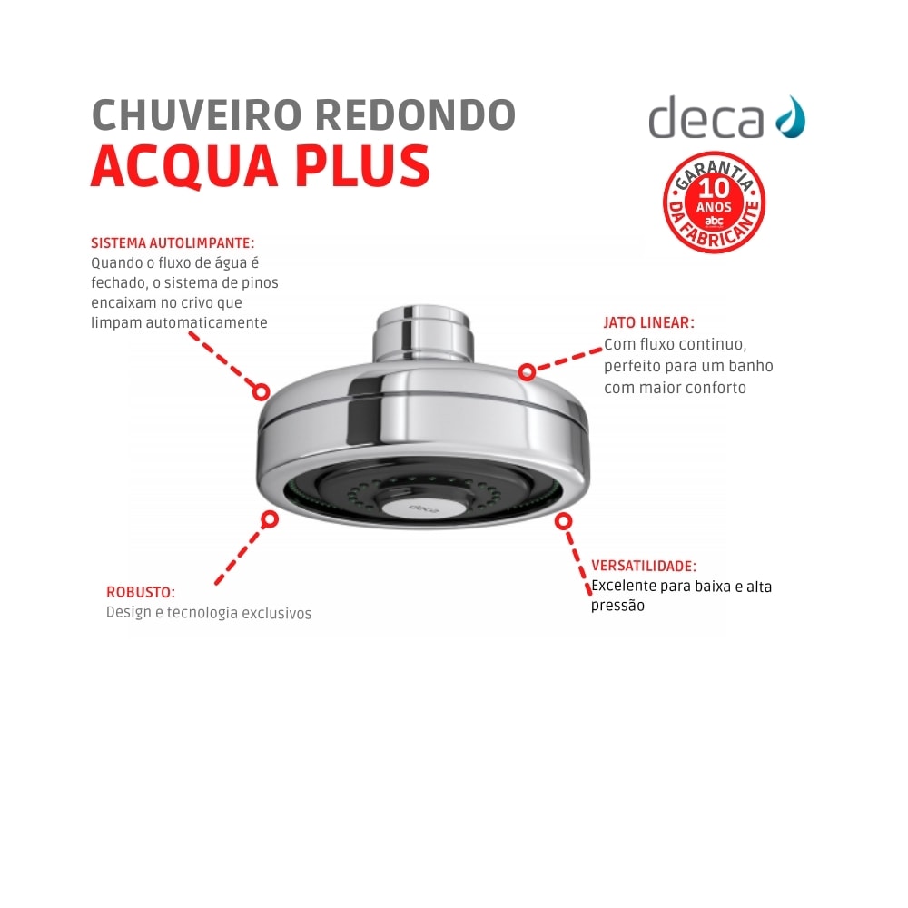 O chuveiro Acqua Plus combina design moderno e tecnologia exclusiva, sendo uma excelente escolha tanto para baixa quanto para alta pressão, proporcionando um banho extremamente confortável. Ele conta com um sistema de autolimpeza, que é ativado automaticamente toda vez que a água é desligada, garantindo maior durabilidade e facilidade de manutenção