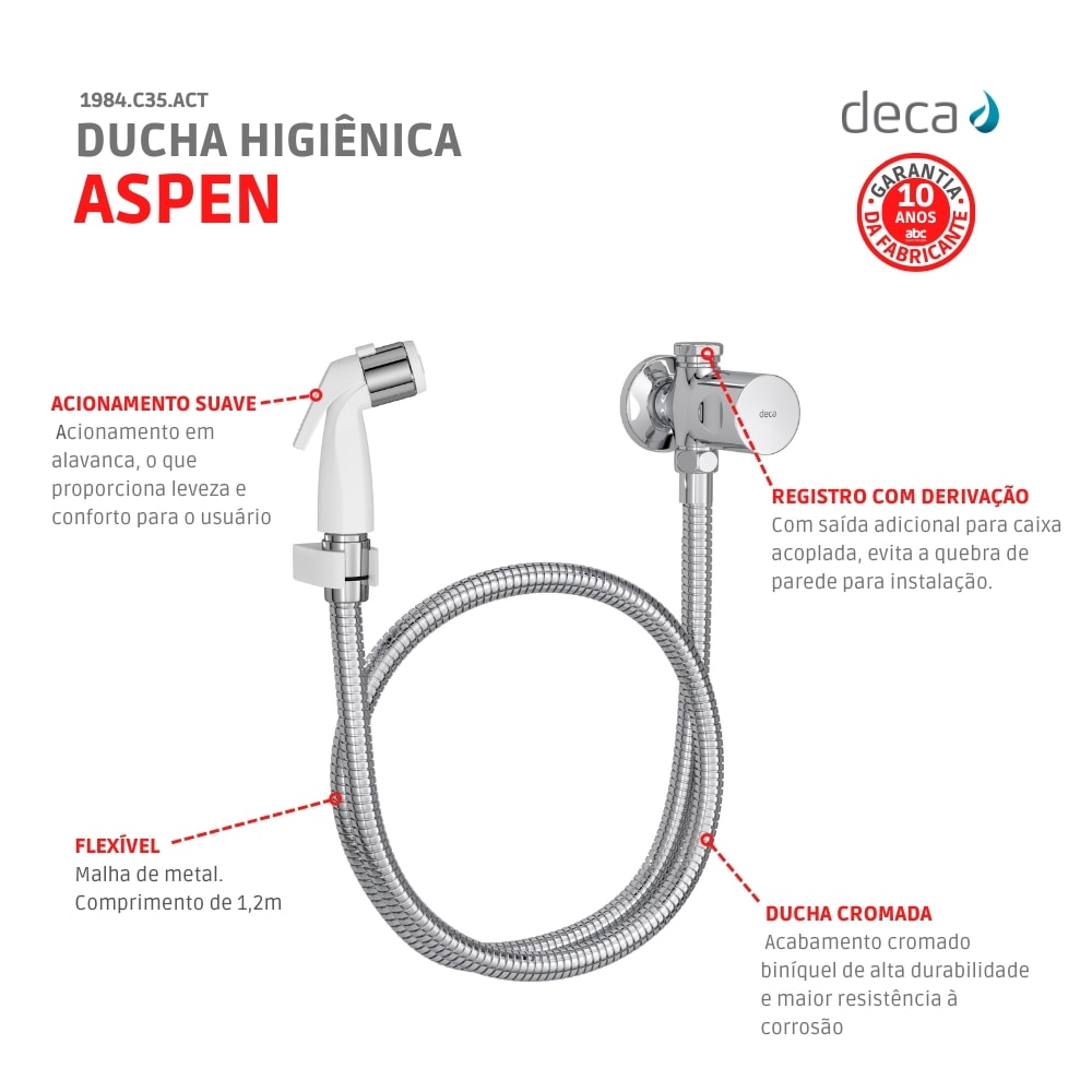 A ducha higiênica Deca foi projetada para ser prática, eficiente e elegante. Seu design moderno e acionamento suave proporcionam um uso confortável e ergonômico. Além disso, sua versatilidade permite que ela se adapte perfeitamente à decoração de diversos tipos de banheiro. A instalação da ducha pode ser feita de duas maneiras: em um ponto de saída d'água exclusivo ou no mesmo ponto de saída d'água do lavatório ou da bacia com caixa acoplada, oferecendo maior versatilidade e flexibilidade. Com a ducha higiênica Deca, você terá uma opção prática e sofisticada para tornar seu banheiro mais funcional e elegante, proporcionando uma experiência agradável e satisfatória ao utilizar o produto