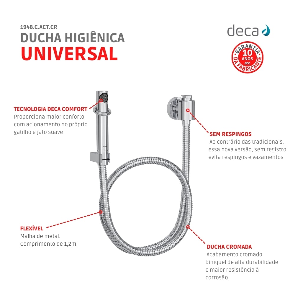 A partir do desenvolvimento de tecnologia patenteada, a Deca apresenta a ducha higiênica universal. Ao contrário das duchas higiênicas tradicionais, esta nova versão não possui registros, evitando respingos e riscos de vazamento. O acionamento no próprio gatilho combinado com o dispositivo Deca Comfort proporciona ainda maior conforto e segurança.