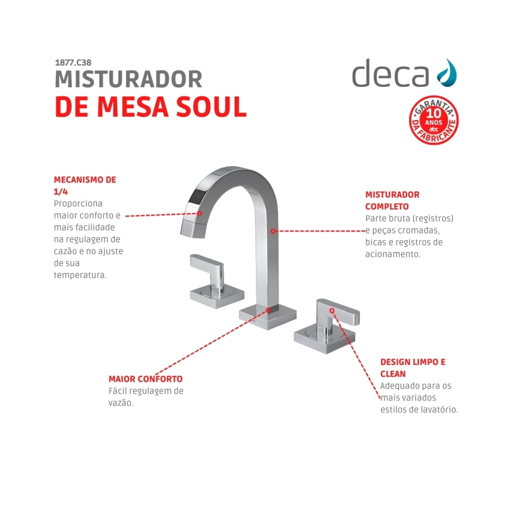 Os metais e louças sanitários DECA, produzidos dentro dos mais avançados padrões de tecnologia e qualidade, incorporando a experiência e a tradição de mais de meio século, sendo garantidas durante 10 anos para defeitos de fabricação nos componentes não-eletrônicos e 1 ano para defeitos de fabricação nos componentes eletrônicos.