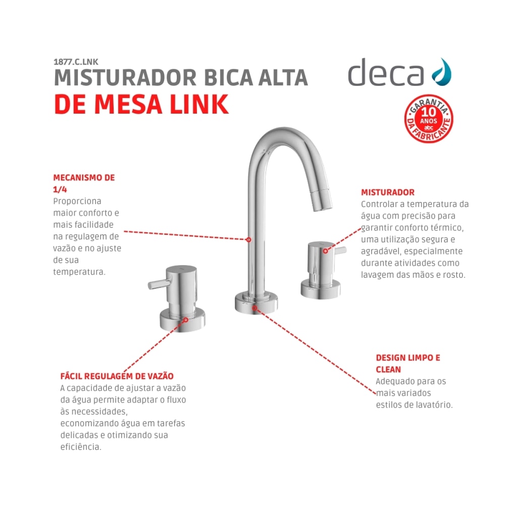 A linha Link é marcada pela combinação da funcionalidade com o design neutro e atemporal. O resultado; é uma linha versátil e elegante; adaptável aos mais diferentes ambientes. Esta linha conta com produtos incríveis! Resistente aos mais variados fatores e impactos presentes em ambientes como o banheiro, o item ainda possui a presença de um arejador. Esse mecanismo é capaz de economizar água ao alterar o volume da vazão sem danos para a intensidade do jato. Por fim, a bica alta é ideal para cubas de apoio ou de sobrepor.