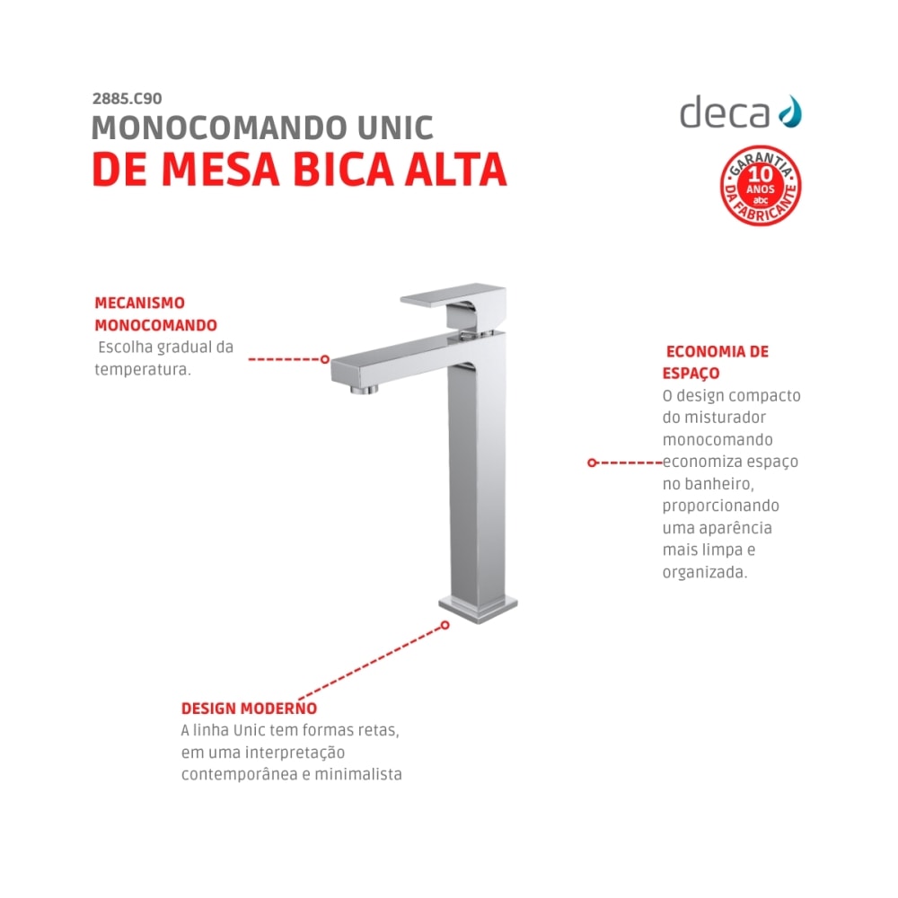 A linha Unic tem formas retas, em uma interpretação contemporânea eminimalista. A linha é composta por grande variedade de produtos, o que a tornamuito versátil, perfeita para ambientes que buscam requinte e sofisticação. Monocomandobica alta, ideal para Cubas de Apoio. Com um único comando, o usuário controlacom precisão a vazão e a mistura de água quente e fria com conforto efacilidade.