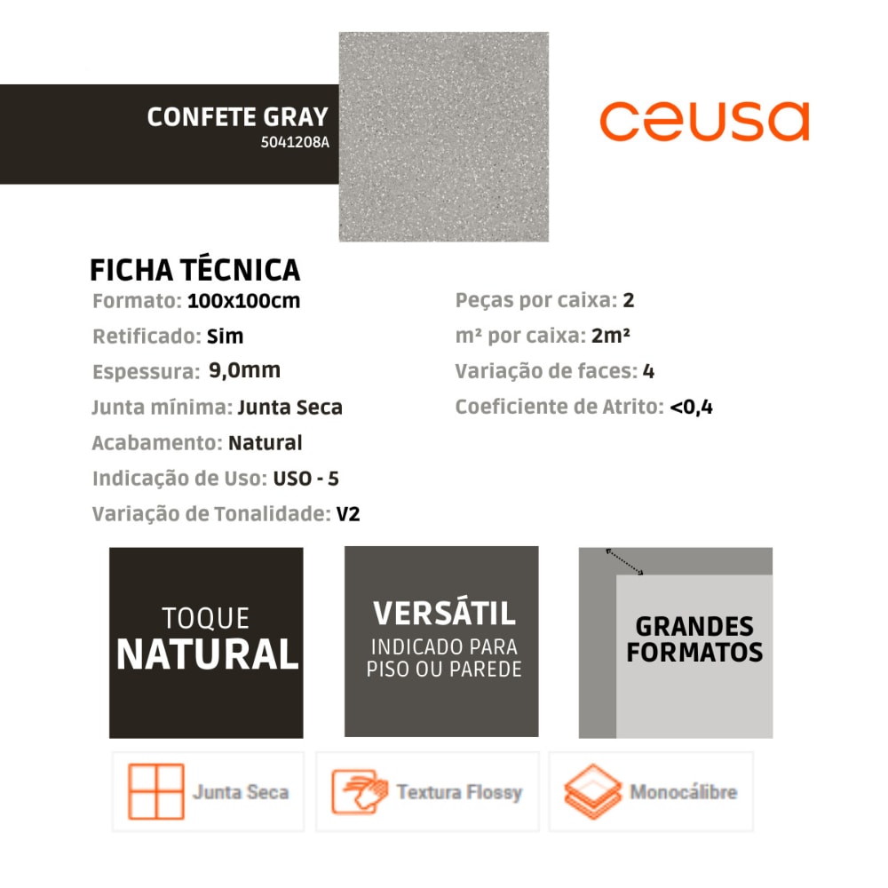 O Porcelanato Ceusa Confete Gray Cinza Natural, com dimensões de 100x100cm e acabamento retificado, oferece uma estética contemporânea e versátil para seus ambientes. A tonalidade cinza natural confere um visual moderno e neutro, enquanto as dimensões generosas e o acabamento retificado proporcionam uma instalação precisa e atualizada. Transforme seus espaços com a sofisticação duradoura deste porcelanato Ceusa.