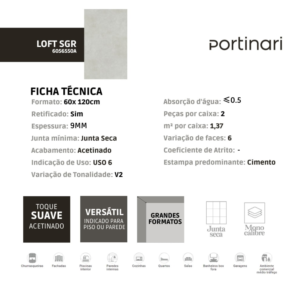 O Porcelanato Portinari Loft Soft Acetinado 58,4x117cm Retificado traz uma proposta de design moderno e suave, inspirada nas nuances neutras e delicadas do concreto. Seu acabamento acetinado garante um toque macio e uma estética discreta e contemporânea, ideal para ambientes que buscam equilíbrio entre sofisticação e funcionalidade. A peça em grande formato e bordas retificadas facilita a aplicação com menos rejunte, criando um efeito visual mais contínuo e harmonioso.