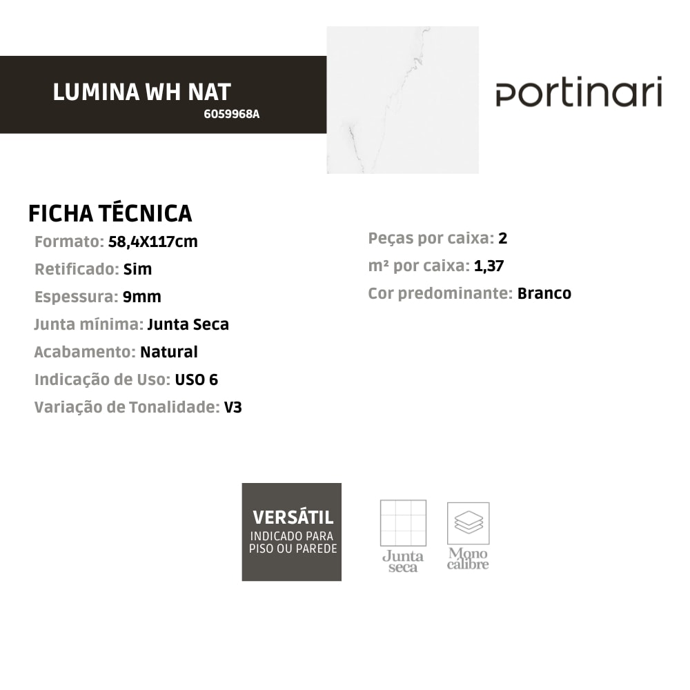 O Porcelanato Portinari Lumina Wh Natural 58,4x117cm Retificado é a escolha perfeita para quem busca um ambiente moderno e iluminado. Seu tom branco natural proporciona leveza e amplitude, enquanto o acabamento natural confere sofisticação e aconchego. As bordas retificadas permitem um assentamento preciso com juntas mínimas, garantindo um visual uniforme e elegante. Versátil e resistente, é ideal para pisos e paredes de diversos ambientes, como salas, banheiros e cozinhas. Com design atemporal, esse porcelanato une funcionalidade e beleza, valorizando qualquer projeto com qualidade superior.