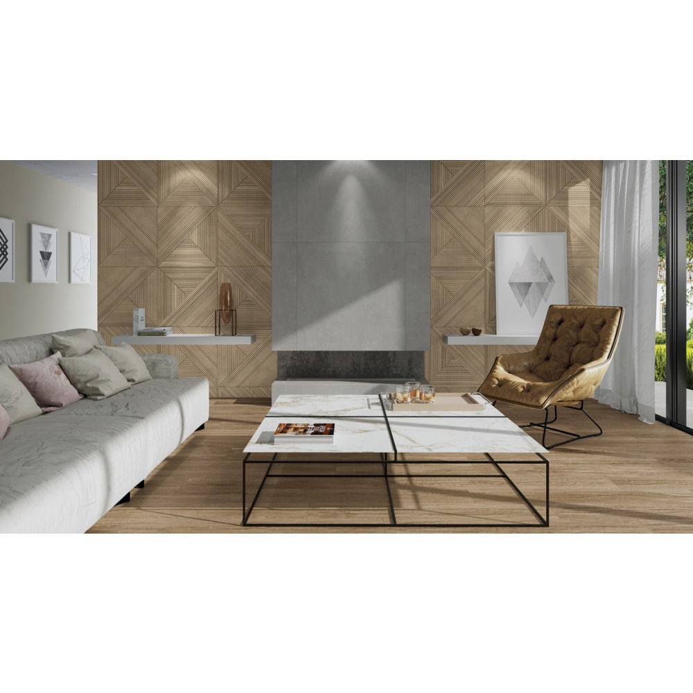 O carvalho está representado em porcelanato na coleção Luthier, com relevos que dão o efeito da madeira entalhada. As peças Luthier Line, no formato 30x120, contam com relevos de linhas e um degradê nos tons da madeira. Já o produto Luthier Decor, no formato 60x60, usa a técnica muxarabis, com trançados em ripas de um trabalho tecido a mão, assim como fazem os profissionais conhecidos como Luthier, que dão vida aos instrumentos musicais, com o uso da madeira.