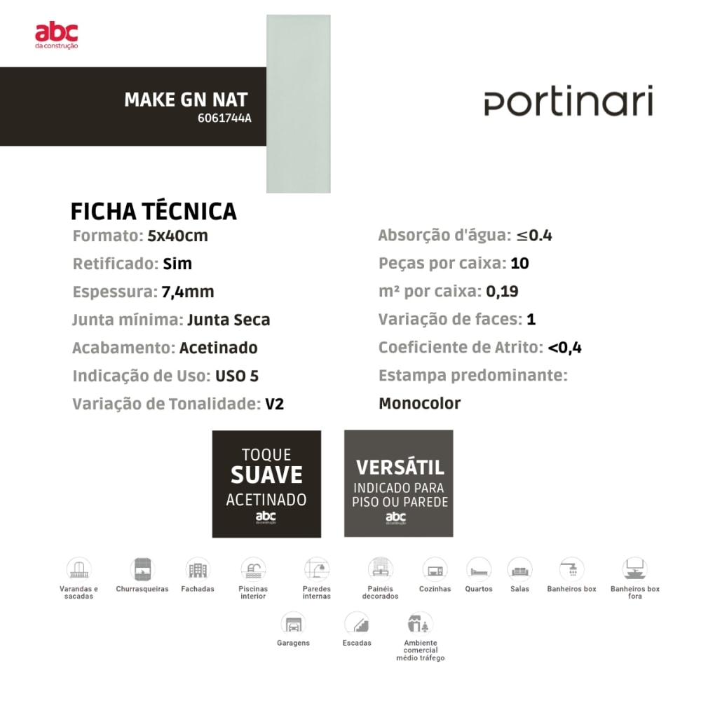 | Local de Uso | USO 5 - Uso em todas as dependências residenciais e ambientes comerciais de tráfego médio. |
