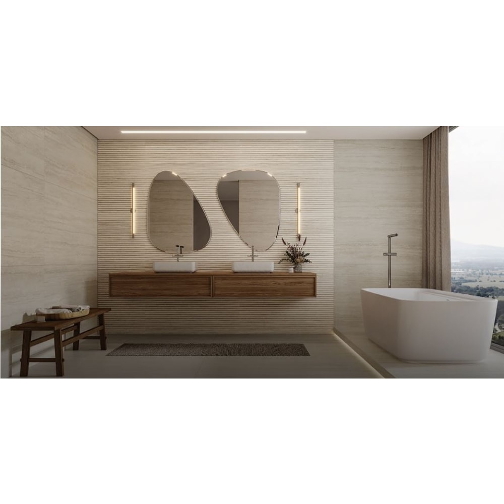 Assim como a mezzo-soprano e cantora lírica que possui a capacidade de entoar tanto notas agudas quanto graves, o mármore travertino é um clássico que se destaca pela versatilidade, sendo capaz de se adequar a diferentes estilos. Na coleçao Mezzo, ele é revisitado e ganha ares contemporâneos, especialmente na versao ripada, que intensifica ainda mais seu apelo tátil. Detalhe: as dimensoes generosas dao mais liberdade para usá-lo de diversas formas, como em tampos de bancada ou mobiliário.