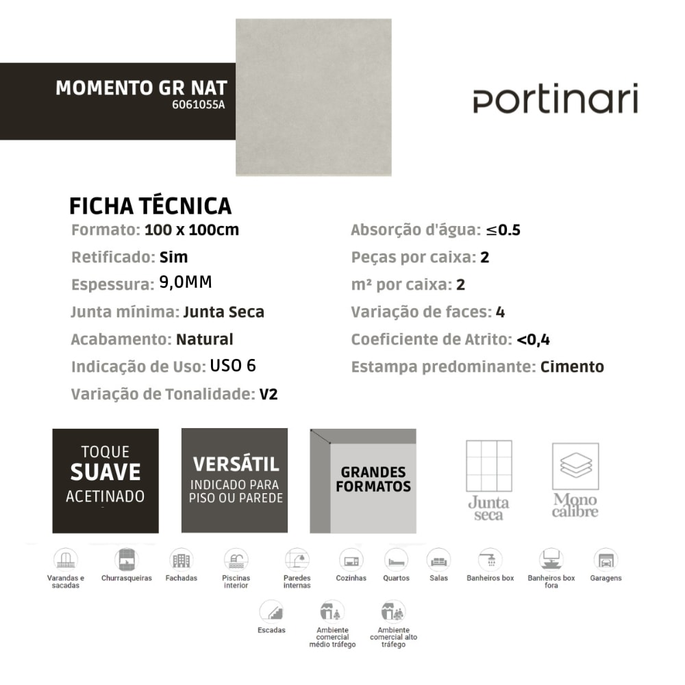 O Porcelanato Portinari Momento DGR Natural 100x100cm traz elegância e modernidade para qualquer ambiente. Seu tom acinzentado suave combina facilmente com diversos estilos, criando uma atmosfera leve e sofisticada. O acabamento natural garante um toque mais aconchegante e autêntico. Ideal para quem busca estética e durabilidade em um só produto.