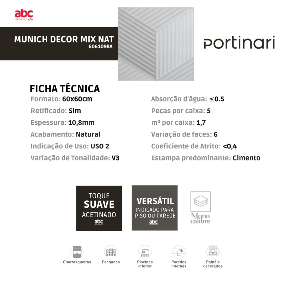 Com uma paleta de cores frias, a coleção Munich se destaca por ser uma linha completa de produtos. Com peças em acabamentos polido, natural e antiderrapante, a coleção pode ser explorada em todos os ambientes tendo a característica marcante de um cimento desgastado nas bordas. A peça decorada, inspirada em cubos tridimensionais, é o complemento para um projeto único e urbano.