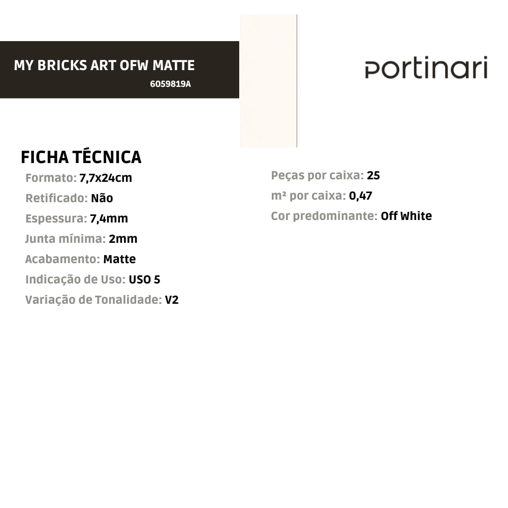 O Porcelanato Portinari My Bricks Art Ofw Matte 7,7x24cm Bold combina o estilo rústico dos tijolinhos com a modernidade do acabamento matte. Sua textura e formato alongado proporcionam versatilidade, ideal para criar ambientes aconchegantes e cheios de personalidade. Com bordas bold e fácil aplicação, esse porcelanato é resistente e perfeito para compor paredes internas com charme e durabilidade. Transforme seus espaços com a beleza atemporal dos tijolinhos.