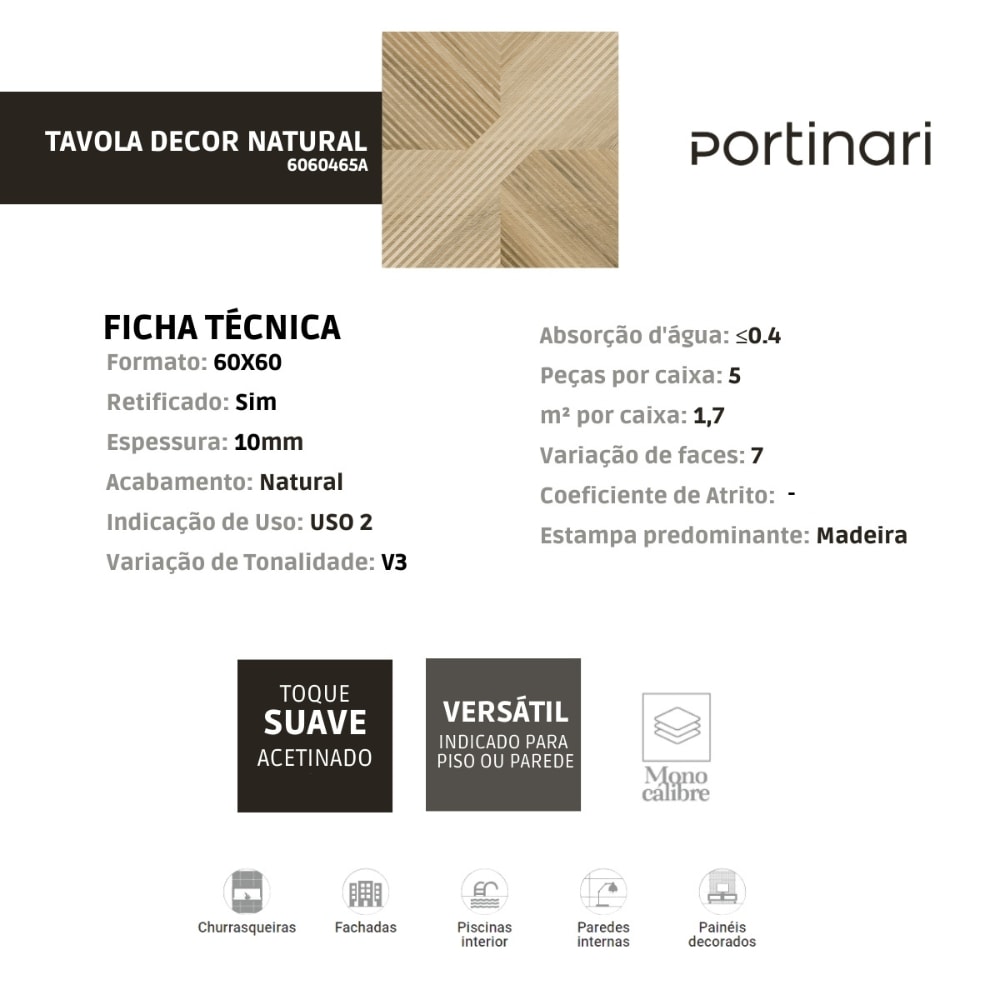 Inspirado nas sofisticadas mesas de madeira, a Tavola traz uma coleção completa de produtos. As linhas desenhadas no Tavola Decor proporcionam que as peças sejam rotacionadas causando diferentes efeitos para a criação de ambientes impactantes. O porcelanato que interpreta de forma fiel a madeira, em formato de régua, desperta sensação de aconchego. Cores quentes, que reproduzem os tons, poucos nós, e movimentos dos veios da madeira, deixam a peça mais clean.