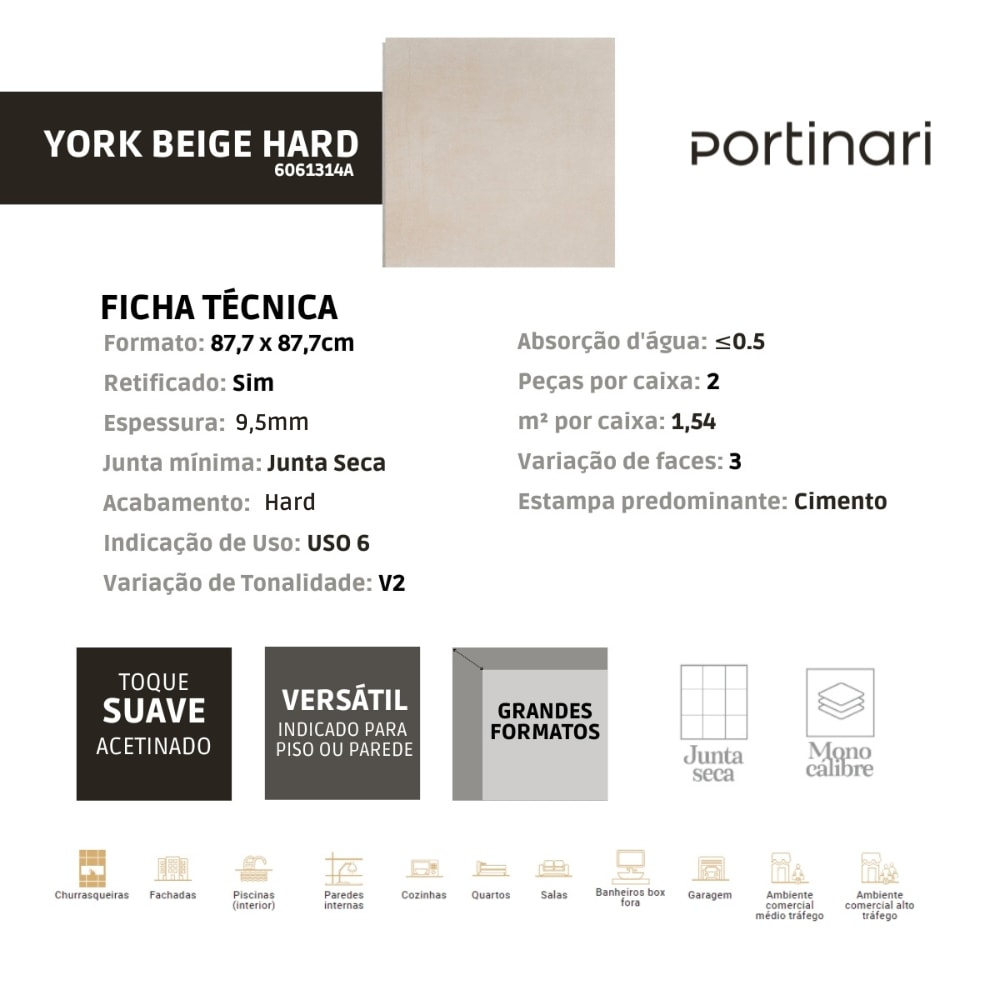 O Porcelanato Portinari York BE Hard 87,7x87,7cm Bege Retificado é a escolha ideal para criar ambientes harmoniosos e sofisticados. Sua tonalidade neutra e acabamento retificado garantem um visual limpo e elegante, perfeito para quem busca sutileza ou deseja ousar com contrastes marcantes na decoração. A combinação de durabilidade e versatilidade faz dele um revestimento perfeito para qualquer ambiente. Para transformar seus espaços com estilo, escolha o Portinari York BE. Visite a ABC da Construção e descubra mais!