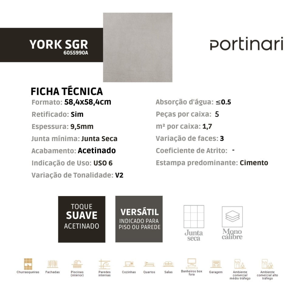 O Porcelanato Portinari York Sgr Acetinado 58,4x58,4cm Retificado traz a suavidade e sofisticação do acabamento acetinado, inspirado no cimento para compor ambientes modernos e minimalistas. Sua tonalidade cinza suave e o formato retificado proporcionam um visual contínuo, ideal para projetos que buscam amplitude e leveza visual. Com resistência e durabilidade, este revestimento é perfeito para áreas internas residenciais e comerciais, oferecendo versatilidade e elegância em qualquer espaço. Aposte no estilo e qualidade da Portinari para seu ambiente.