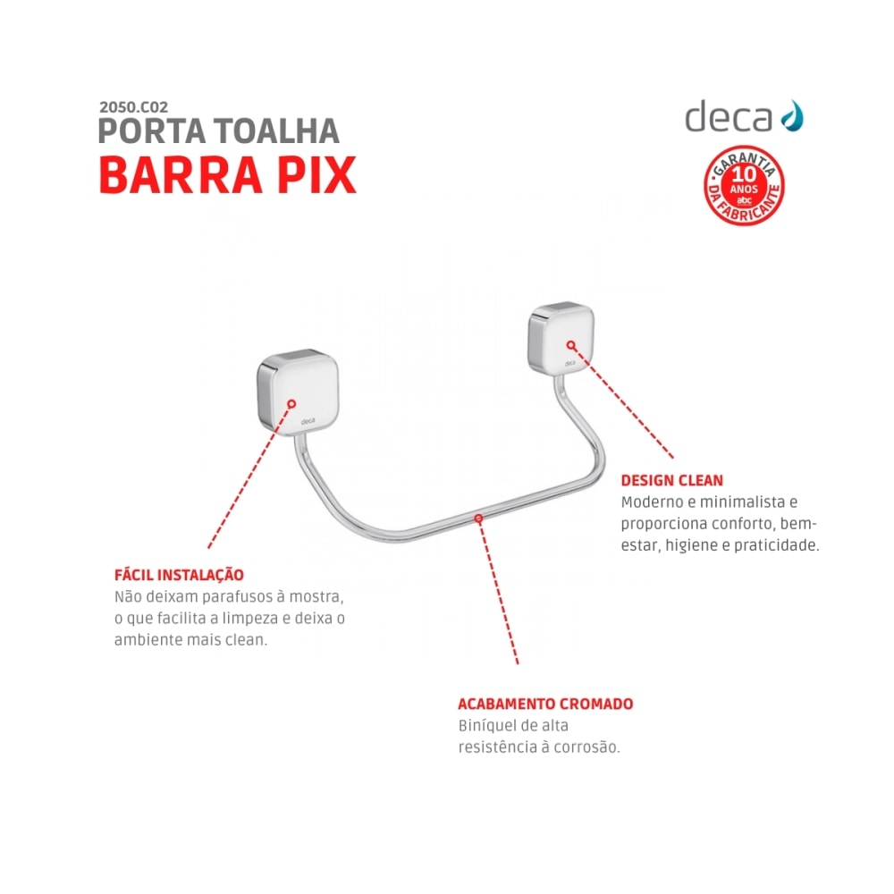 A linha de acessórios Pix da Deca oferece uma harmonia perfeita de linhas retas, trazendo elegância e estilo para o seu banheiro. Com seu design exclusivo, este porta toalha é a escolha ideal para quem busca praticidade, qualidade e um visual bonito. O porta toalha Pix oferece o que há de melhor em acessórios para o seu banheiro. Com a durabilidade e qualidade que são marcas registradas da Deca, essas peças adicionam beleza e elegância ao ambiente.