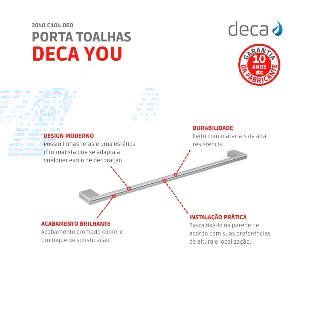 O Porta Toalhas You Cromado Deca de 60cm combina funcionalidade e design elegante para complementar o ambiente do banheiro. Com acabamento cromado, adiciona um toque contemporâneo ao espaço. Seu comprimento de 60cm proporciona espaço generoso para pendurar toalhas, mantendo-as organizadas e acessíveis. Fabricado pela Deca, renomada marca de produtos para banheiro, o porta toalhas é durável e resistente à corrosão. Além de sua utilidade prática, ele contribui para a estética moderna e sofisticada do ambiente.