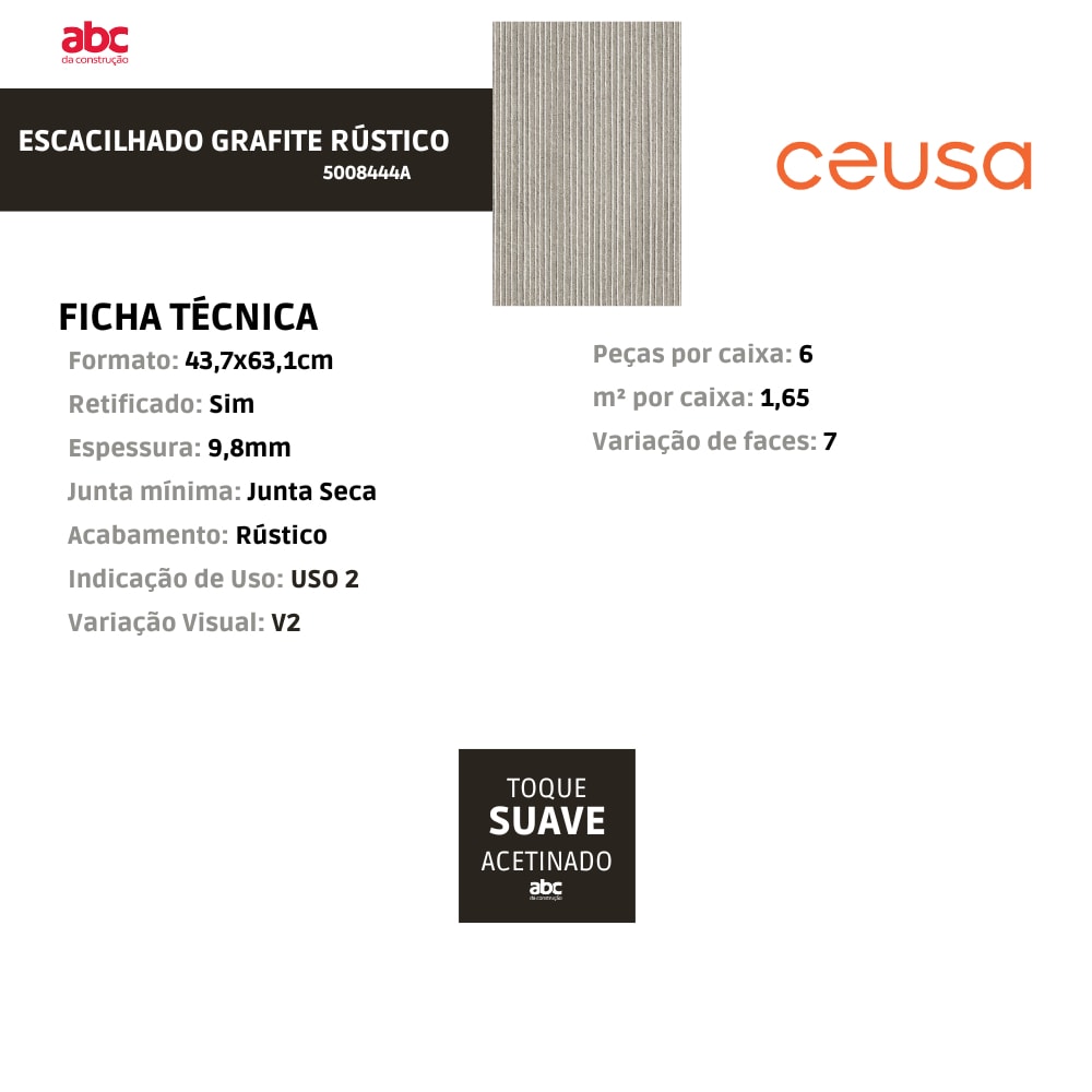 O Revestimento Ceusa Escacilhado Grafite Rústico Cinza 43,7x63,10cm Retificado é uma excelente escolha para o cliente devido ao seu design rústico e contemporâneo que agrega personalidade e elegância aos ambientes. Suas bordas retificadas garantem um assentamento preciso com rejuntes mínimos, proporcionando um acabamento mais uniforme. Além disso, a tonalidade cinza grafite é versátil e sofisticada, ideal para compor diversos estilos de decoração, enquanto a alta durabilidade e fácil manutenção são perfeitas para uso em áreas internas e externas.