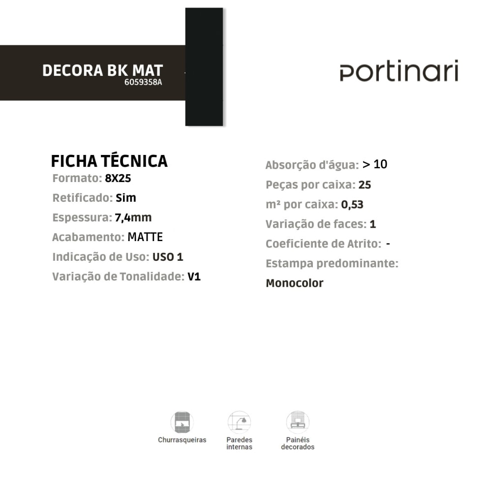 O Revestimento Portinari Decora Black Matte 8x25cm Bold é a escolha ideal para ambientes que buscam um toque de modernidade e sofisticação. Com acabamento matte e tons profundos de preto, ele confere um estilo elegante e contemporâneo, permitindo a criação de contrastes marcantes ou composições monocromáticas. Seu formato compacto possibilita layouts criativos em cozinhas, banheiros e áreas de destaque.
