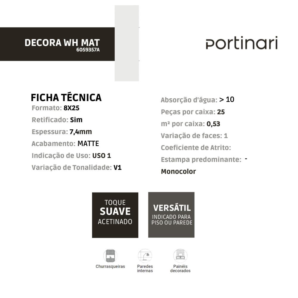 O Revestimento Portinari Decora White Matte 8x25cm Bold traz sofisticação e versatilidade aos ambientes. Com acabamento matte e design clean, suas peças pequenas permitem composições criativas e personalizadas, destacando a elegância do branco em qualquer espaço. Ideal para quem busca um toque moderno com discrição, ele harmoniza bem em cozinhas, banheiros e áreas decorativas.