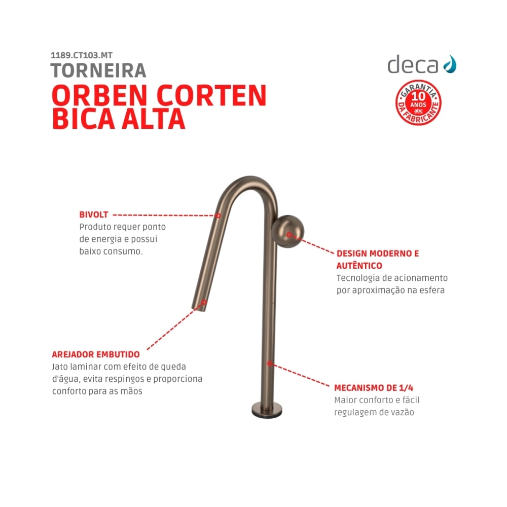 A Torneira de Mesa Touchless Bica Alta para Lavatório Corten Matte da Deca é a combinação perfeita de tecnologia, elegância e praticidade. Com seu sensor de presença, ela oferece um acionamento automático, garantindo maior higiene e evitando o contato direto, o que é perfeito para manter seu banheiro mais limpo e moderno. O acabamento Corten Matte traz um toque de sofisticação ao ambiente, enquanto a bica alta é ideal para cubas de apoio, criando um visual leve e funcional.