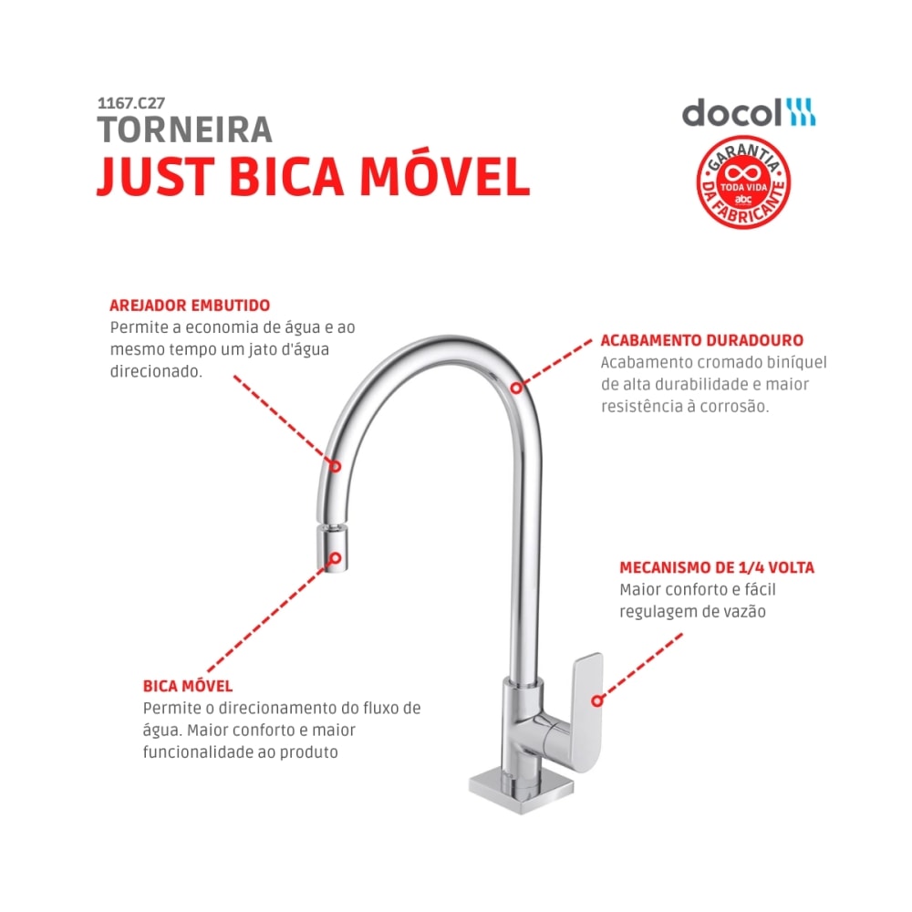 - Bica móvel: permite o direcionamento do fluxo de água. Maior conforto e maior funcionalidade ao produto