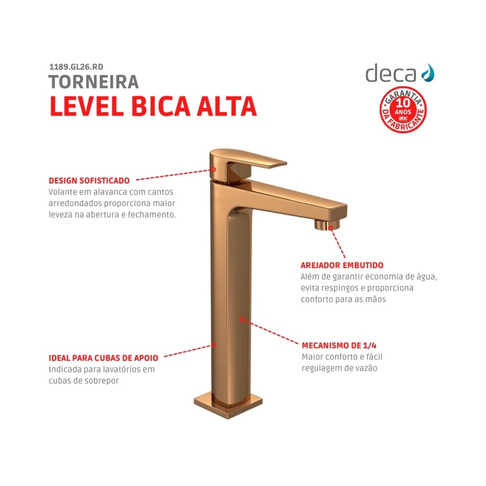 A linha Level é reconhecida pelo design contemporâneo composto por formas retas e pela funcionalidade inerente às linhas de metais Deca. Seu ambiente ficará muito mais completo com a Torneira Deca Level. Possui um design clean, unindo formas retas e sutis na cor cromada, ideal para projetos modernos e sofisticados. Ela possui abertura facilitada com ¼ de volta, proporcionando mais conforto e economia. E ainda, um arejador embutido que valoriza ainda mais a eficiência.