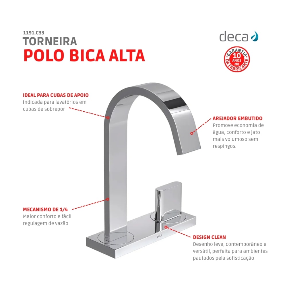 A Torneira Polo da Deca apresenta formas retas e planas, esse design resulta em uma peça de desenho leve, contemporâneo e versátil, perfeitamente adequada para ambientes sofisticados. Além disso, a torneira possui um arejador embutido que proporciona economia de água e conforto de maneira simples e eficaz. O arejador incorpora bolhas de ar ao fluxo de água, resultando em um jato mais volumoso e sem respingos.