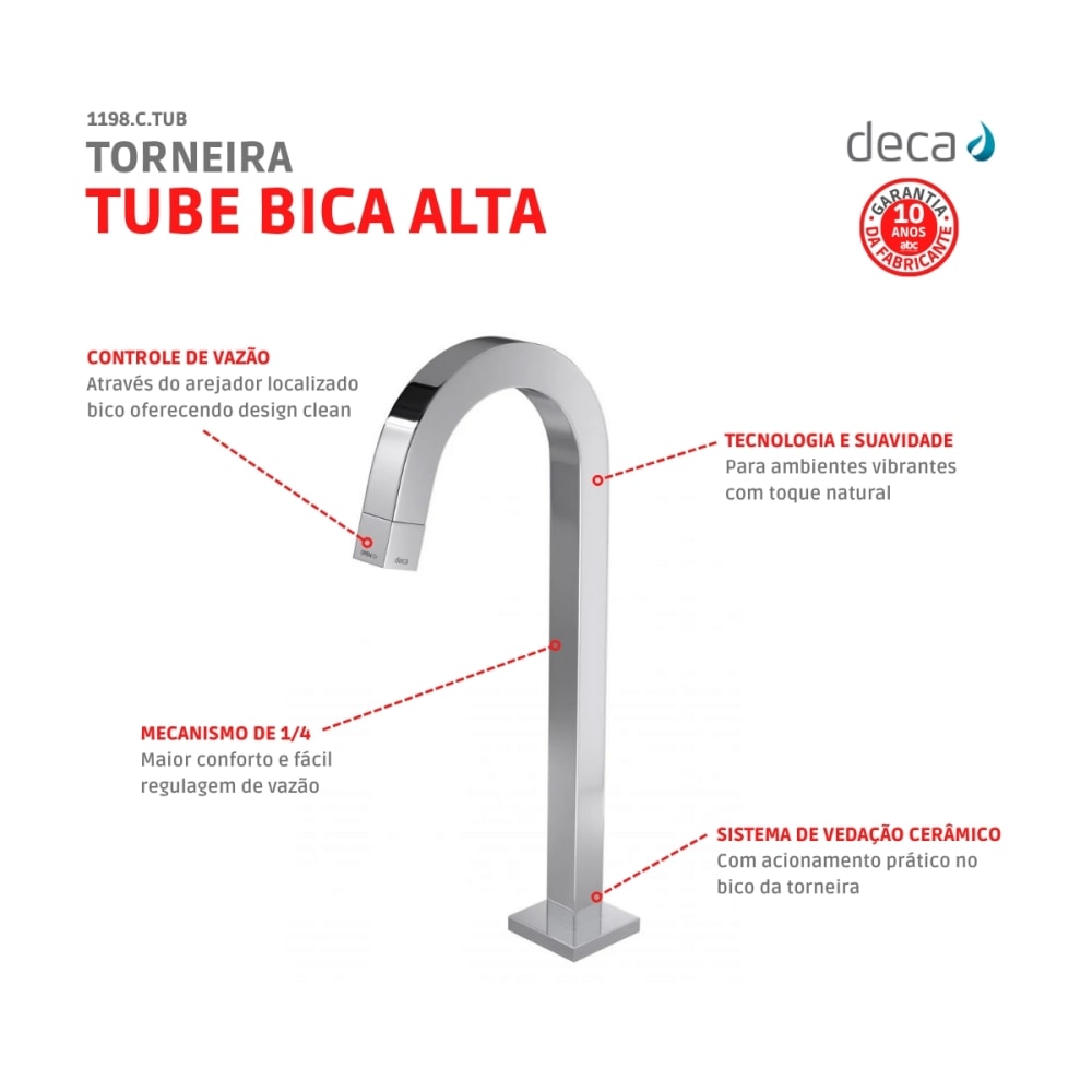 O modelo possui ainda mecanismo de 1/4 volta, maior conforto e fácil regulagem de vazão. A Torneira Para Banheiro Deca Tube Bica Alta Mesa Cromado permite o controle de vazão através do arejador.