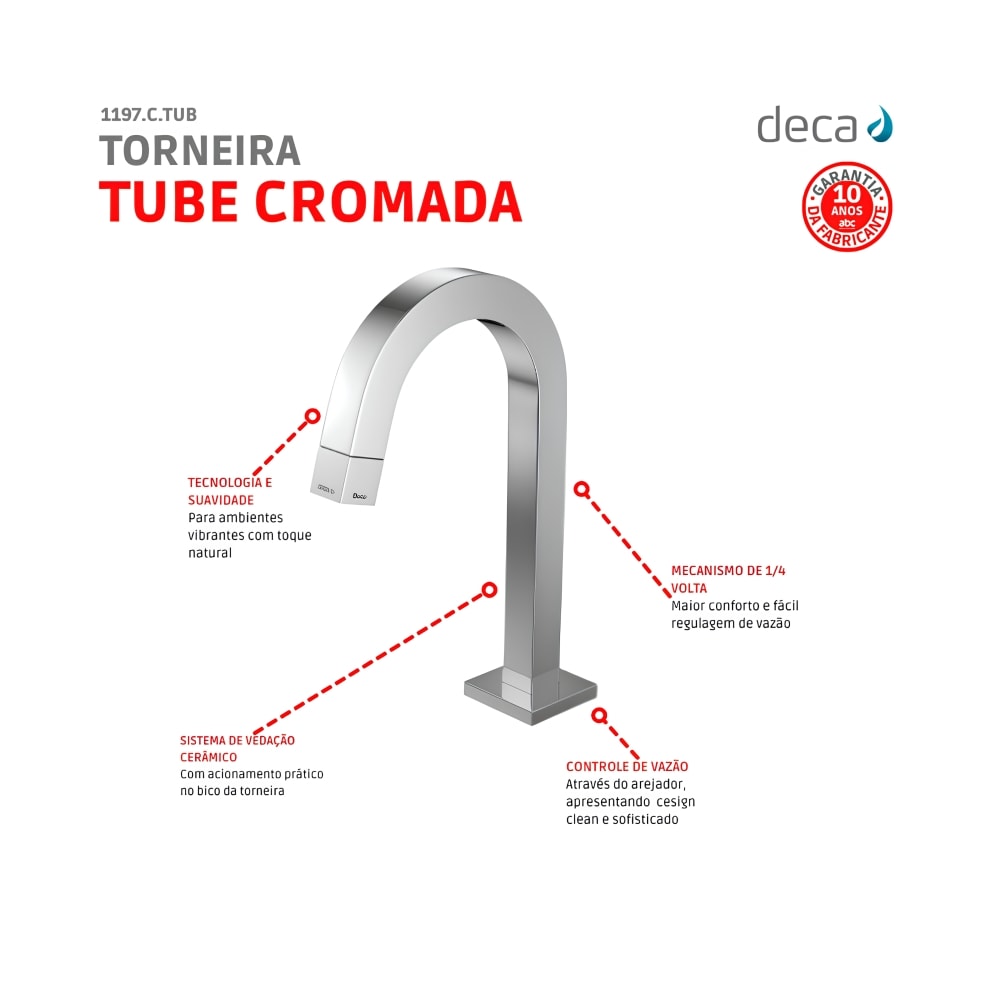 A linha Tube configura a interpretação máxima do design associado à funcionalidade. Oferece diversas opções de torneiras; o que viabiliza sua aplicação nas mais diferentes situações e nos mais arrojados projetos. Acabamento Deca Coat, Cromo este acabamento mescla tecnologia e suavidade, para ambientes vibrantes com toque natural. Sistema de vedação cerâmico com acionamento prático no bico da torneira, abertura com apenas 1/4 de volta. Funcionamento perfeito em baixa e alta pressão
